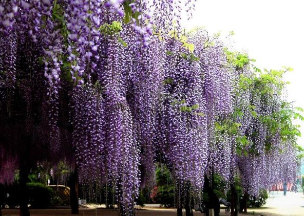 紫藤因為擁有較強的攀爬性,一般種植在大門扣或者是圍墻外面。當大量的紫藤垂下來的時候,景色非常宜人。